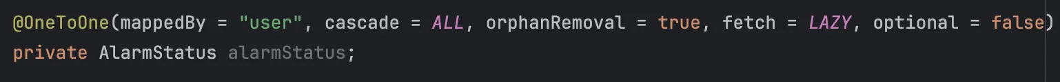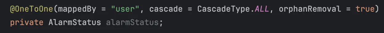 이를 다시 생각해보니, 양방향 OneToOne 관계라는 것이 결국 그냥 내부의 속성으로 들어가는게 맞지 않았을까?라는 생각이 든다. 저 AlarmStatus가 User 내부로 들어왔을 때 User의 정규화에도 위배되지 않기도 하고, 구조 결정의 이유 중 하나였던 새로운 알람 기능이 생기면 User의 컬럼이 늘어나는건 AlarmStatus 테이블을 따로 두어도 똑같이 컬럼이 늘어나지 않나?라는 생각이 들었다.