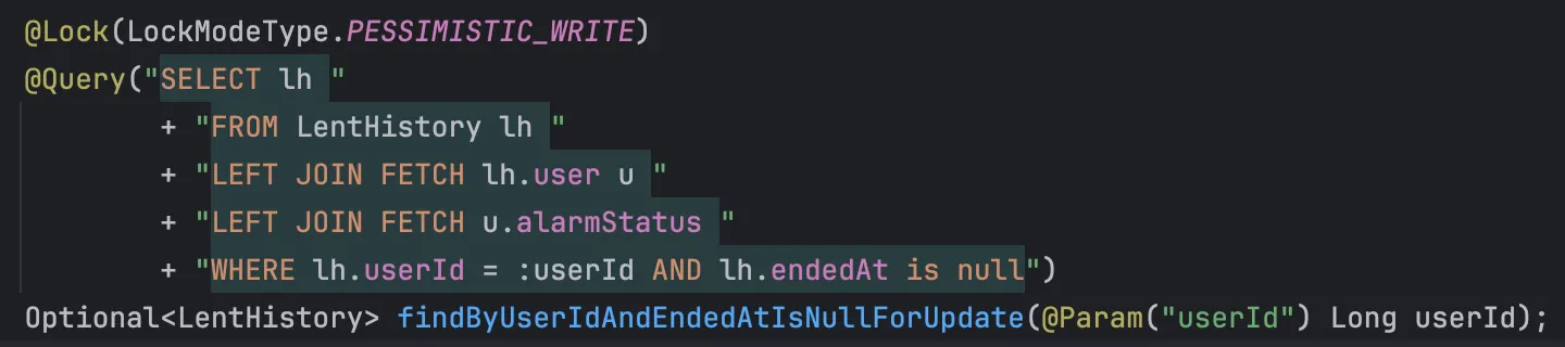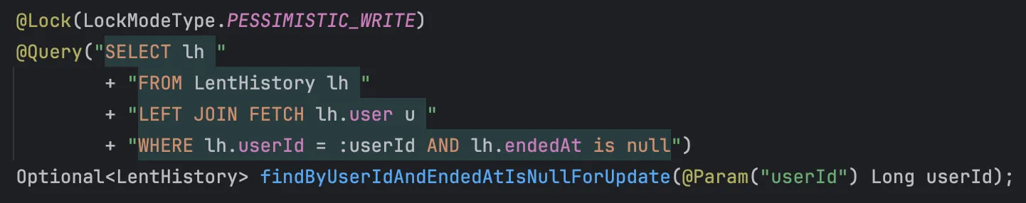 LentHistory userLentHistory = lentQueryService.getUserActiveLentHistoryWithLock(userId);