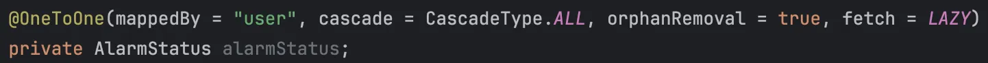 User와 AlarmStatus는 양방향 OneToOne 관계를 가지고 있는데, LAZY 로딩 설정이 안되어있다. LAZY 로딩이 설정이 되어 있지 않으니, User를 꺼내 사용할 때 EAGER 로딩으로 AlarmStatus를 추가로 조회해오는 것이다.