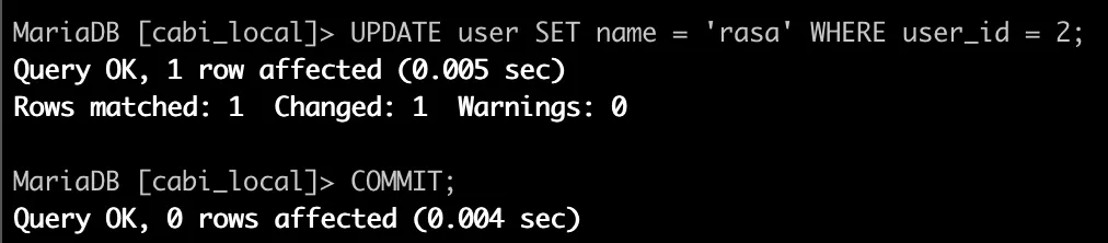이 때 트랜잭션 A에서 commit이나 rollback을 통해 트랜잭션을 종료하게 되면, 해당 락을 풀고 트랜잭션 B에서는 락을 얻어 수행을 완료하게 된다.