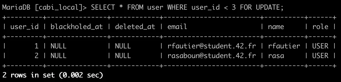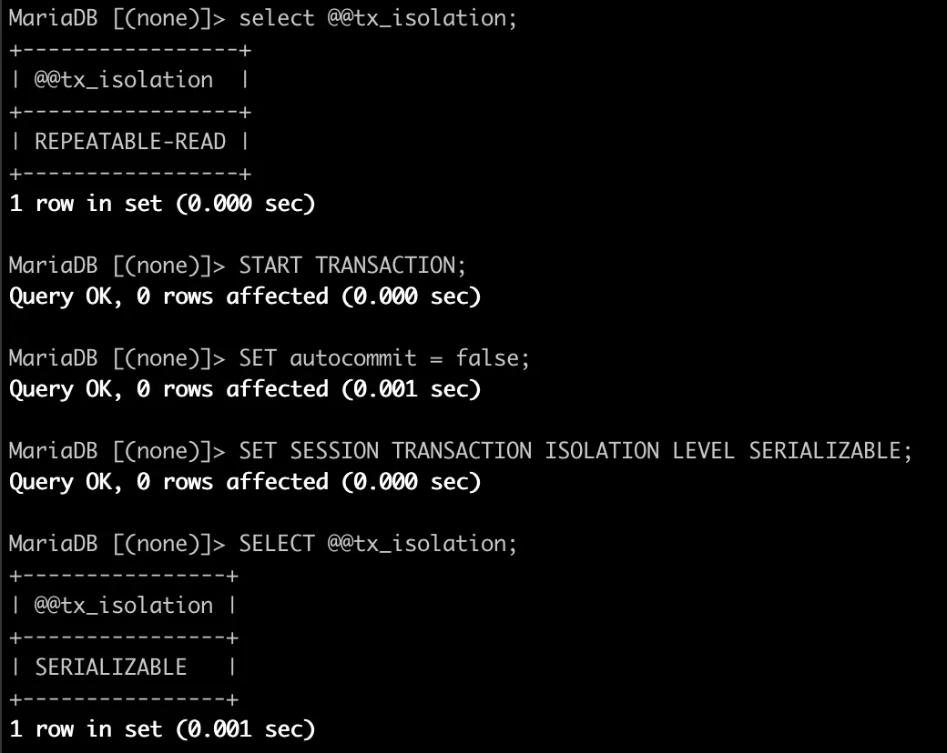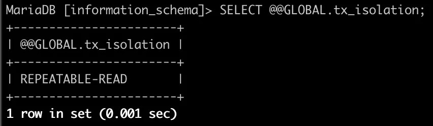 GLOBAL 변수를 통해 MariaDB의 경우 default 설정이 REPEATABLE-READ로 되어있는 것을 확인할 수 있다.