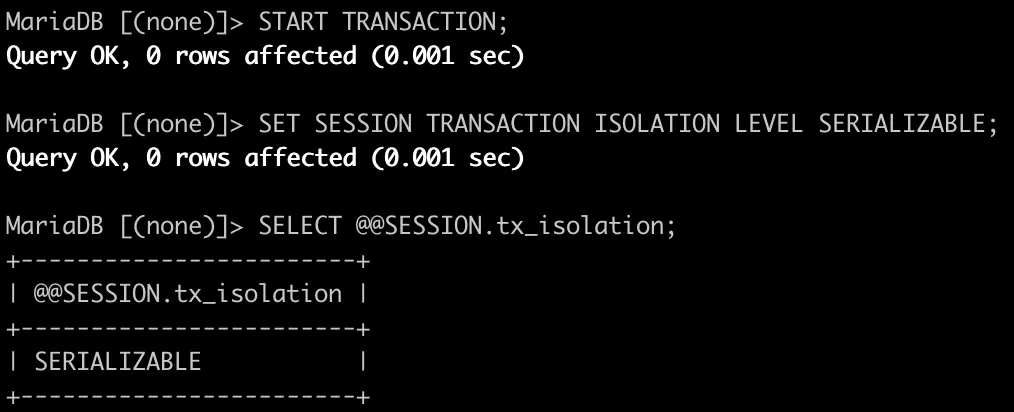SET SESSION TRANSACTION ISOLATION LEVEL SERIALIZABLE;