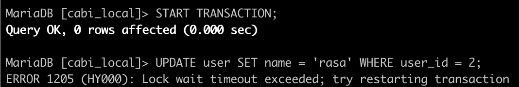 만약 일정시간동안 락을 얻지 못하면 아래와 같이 timeout이 발생한다.