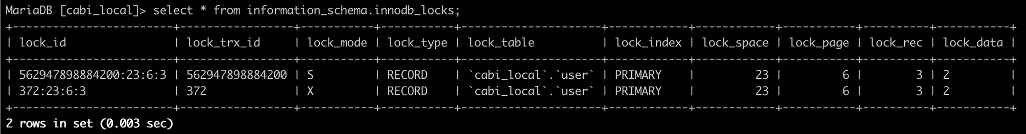 위 상황에서의 락을 살펴보면 트랜잭션 A에서 S Lock을 얻고, B에서 X락을 얻기 위해 대기하고 있게 된다.