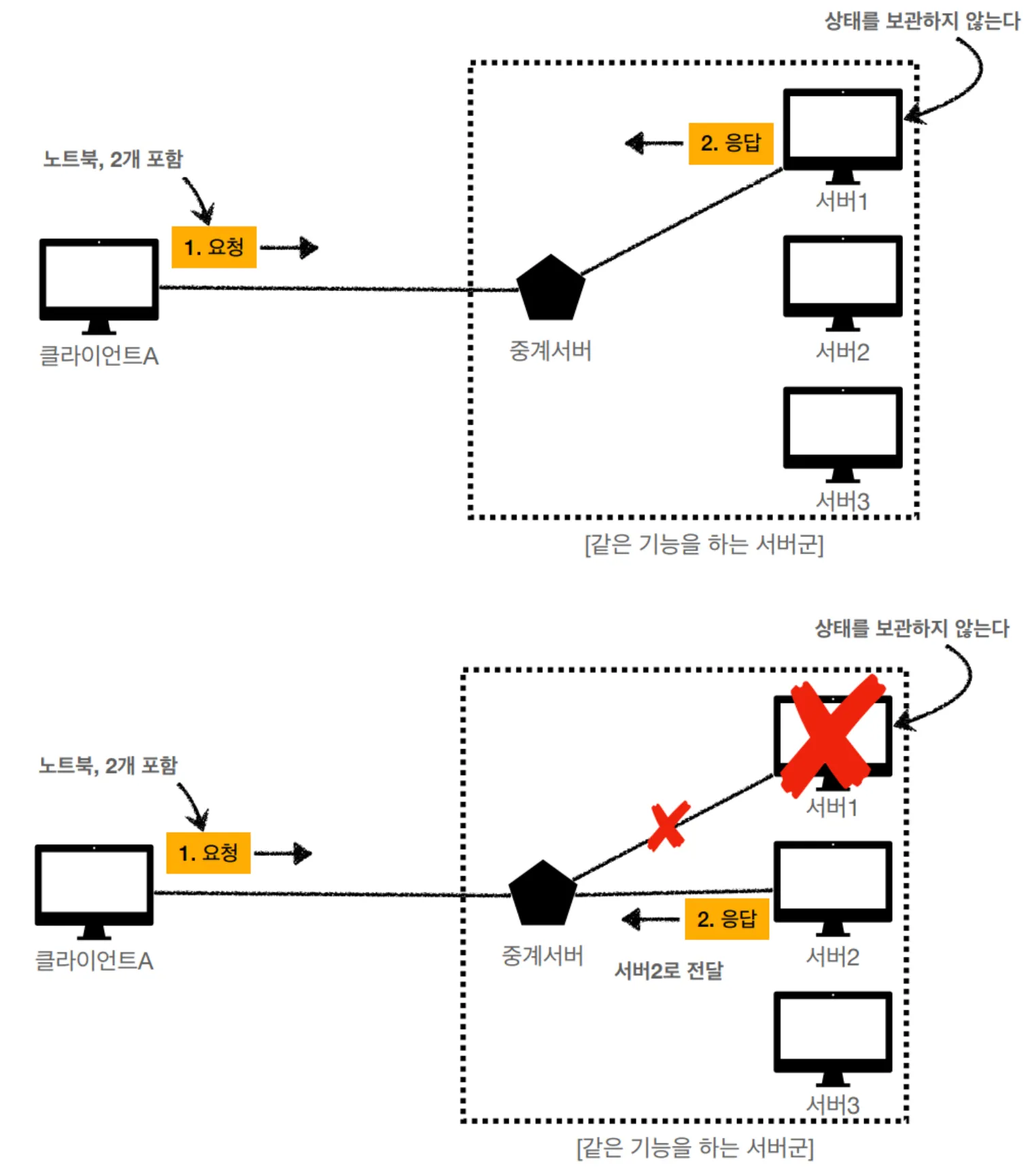 상태를 보관하지 않기 때문에 서버 1에 문제가 생겨도 서버 2에서 이어 응답하는데 문제가 없다. 같은 이유로 서버 확장이 용이하다는 장점이 있다.