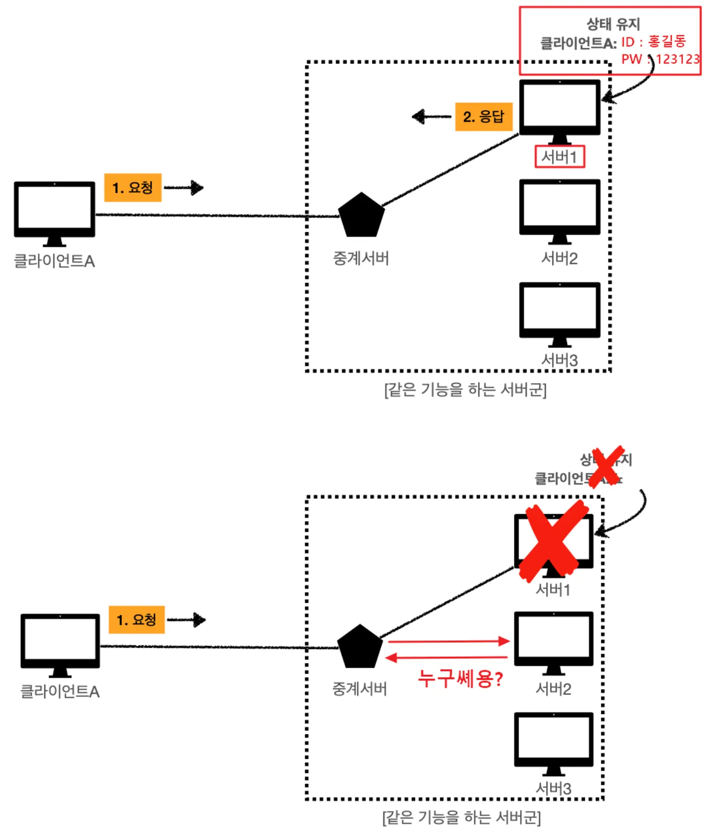 stateful 방식은 서버가 멈추거나 다른 이유로 사용하지 못할 때 다른 서버를 통해 서비스를 지원하게 되는 경우, 기존의 서버에서 유지하고 있던 상태값들을 전부 잃어 새로 상태값들을 저장해야한다는 문제가 있다.