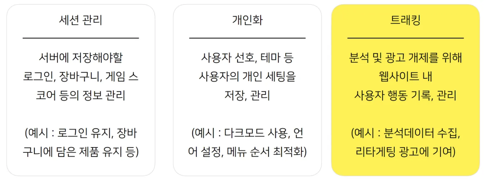 로그인과 같은 서버 간의 일시적인 연결에서 세션 관리에 사용되고, 웹사이트에 대한 사용자 선호도나 테마와 같은 설정값을 개인화하거나 사용자의 행동을 기록하고 분석하여 광고를 띄우는 트래킹의 용도로도 사용된다.
