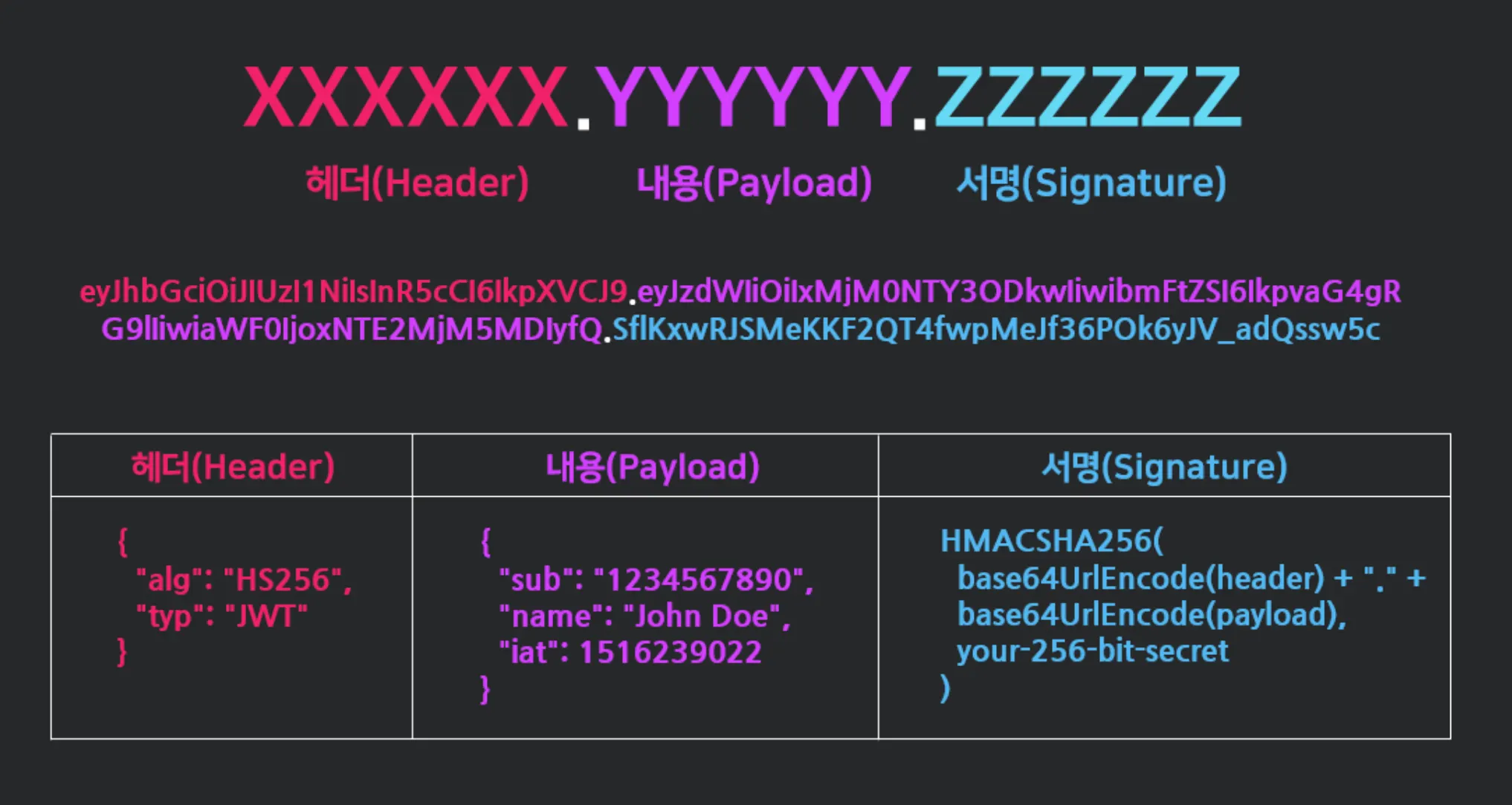 JWT는 .을 기준으로 나누어지는 Header, Payload, Signature인 문자열의 조합이다.