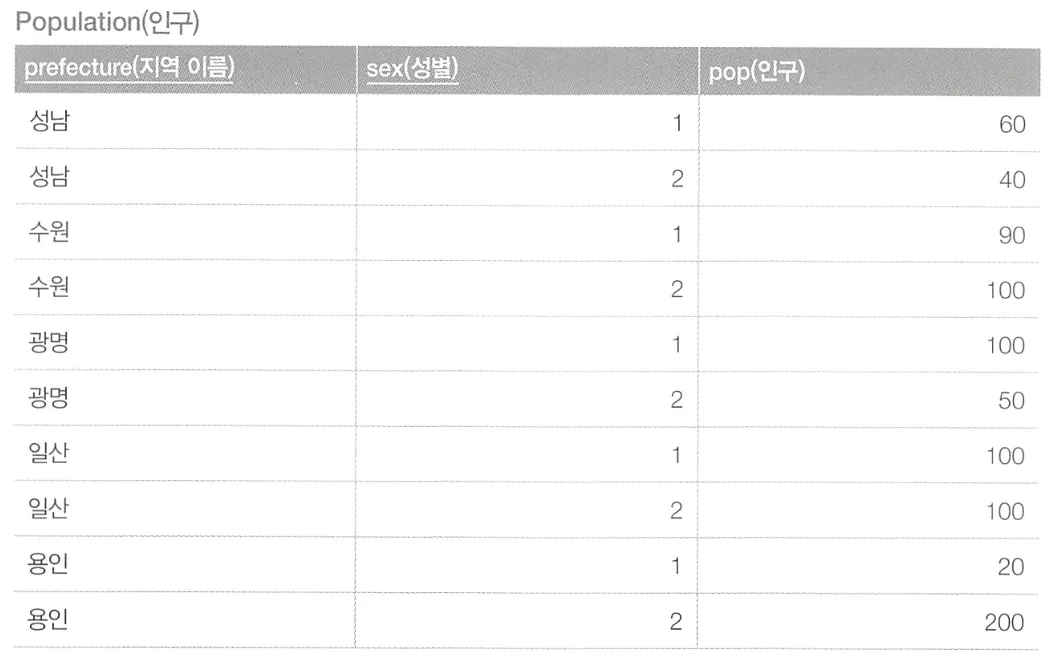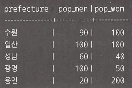 위의 테이블에서 지역별로 남자 인구, 여자 인구를 한 번에 볼 수 있게 아래처럼 출력하고자 한다.