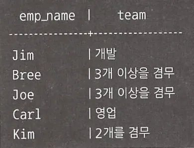 위 테이블에서 아래 출력처럼 소속된 팀의 개수에 따라 팀의 이름을 다르게 출력하려 한다.