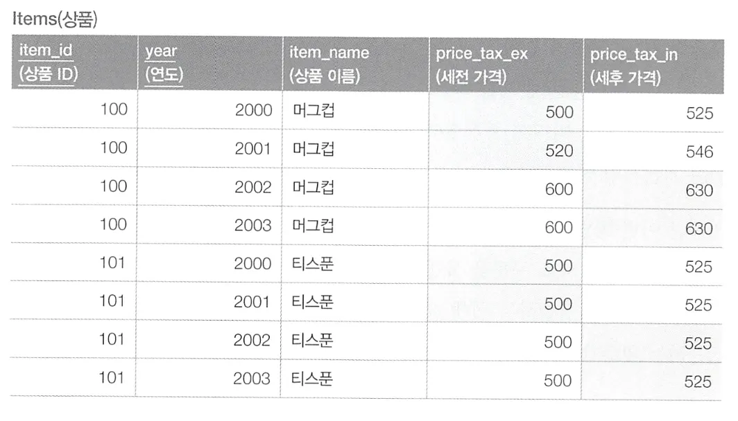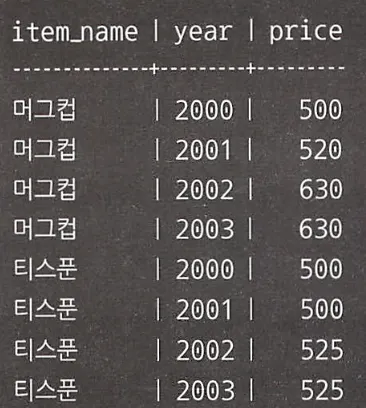 이와 같은 테이블이 있고, 이를 조회하여 넘겨줄 때 연도를 기준으로 2001년 이전은 세전 가격을 주고 2002년 이후는 세후 가격을 넘겨주어 아래와 같은 결과를 만들고자 한다.