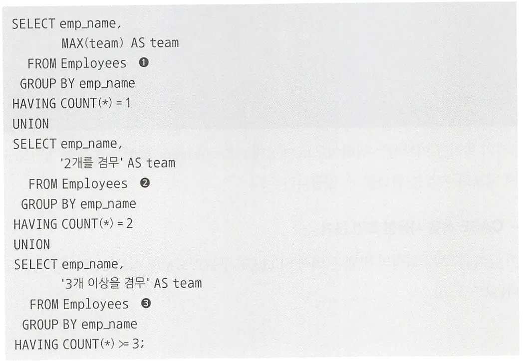 UNION을 사용한 조건 분기는 ‘SELECT 구문’을 기본 단위로 하기 때문에, 이는 절차 지향형 프로그래밍의 발상을 벗어나지 못한 방법이다. CASE 식을 사용한 조건 분기는 ‘식’을 기본 단위이고, SQL에서는 구문 위주보다 식 위주의 사고를 하는 것이 더 좋다.