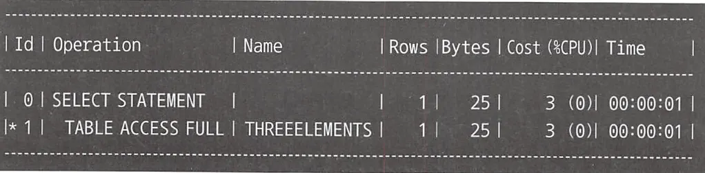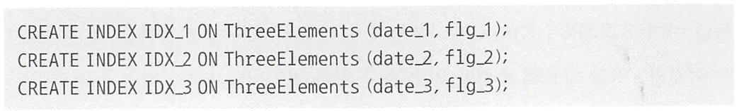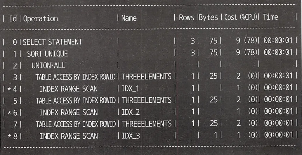 이와 같이 인덱스를 설정하고, UNION을 통해 쿼리를 작성하면 실행 계획은 아래와 같이 ThreeElements 테이블에 3번 접근하게 된다.
