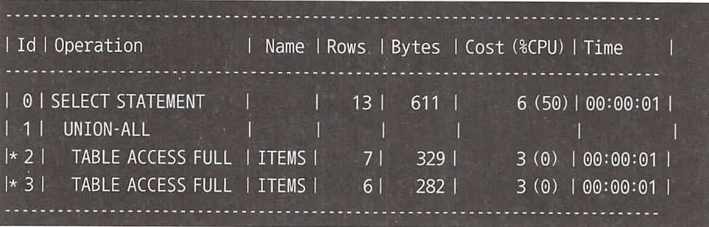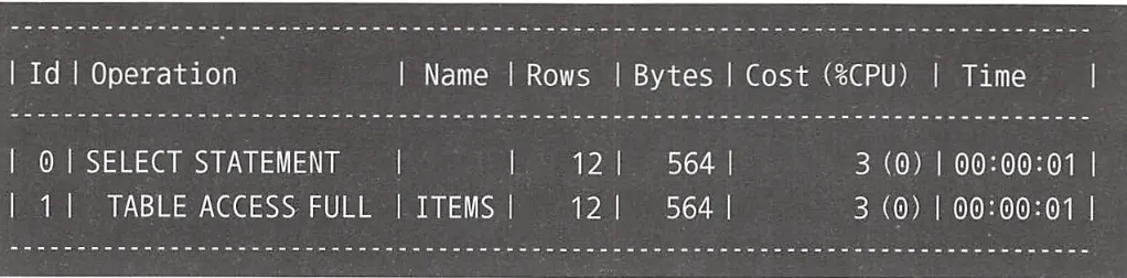 두 DBMS 모두 Items 테이블에 2번 접근해, 거의 동일한 로직을 TABLE ACCESS FULL로 조회해오는 것이다.