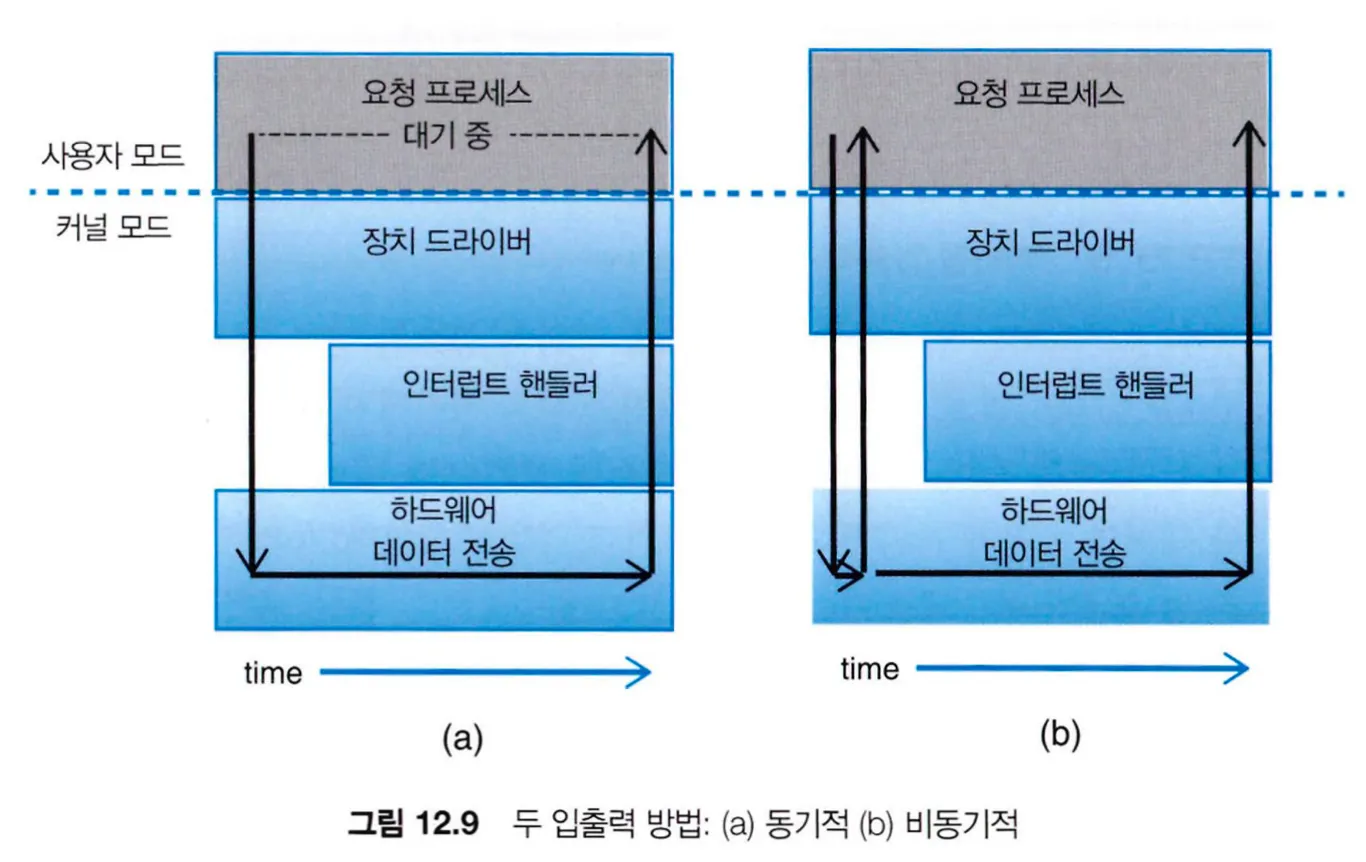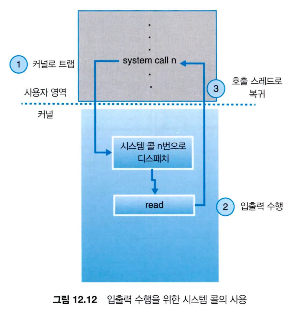 응용 프로그램이 봉쇄형(blocking) 시스템 콜을 하면 호출한 스레드는 block 상태로 들어가 대기 큐로 옮겨진다. 추후 입출력이 끝나면 다시 실행 큐로 돌아와 실행이 재개되고, 프로그램은 입출력 시스템 콜이 되돌려 준 값을 받게 된다.