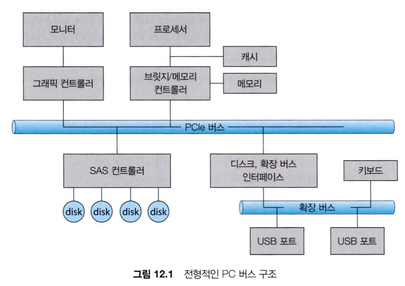 버스는 컴퓨터 다양한 종류가 있는데, PCI 버스(일반적인 PC system bus)가 프로세서-메모리 서브 시스템을 고속 장치와 느린 장치들(키보드, USB 포트 등)을 연결하는 확장 버스(expansion bus)에 연결한다.