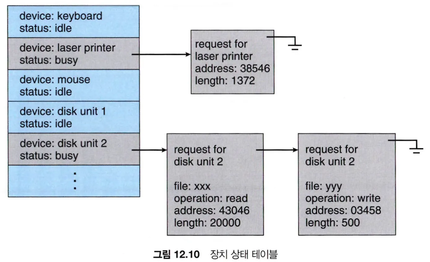 커널이 비동기적 입출력을 제공한다면 커널은 동시에 많은 입출력 요청을 추적해야하고, 이를 위해 운영체제는 각 장치 상태 테이블(device-status table)에 대기 큐를 연동한다. 각 테이블 항목은 장치의 종류, 주소, 상태 등을 가리킨다.