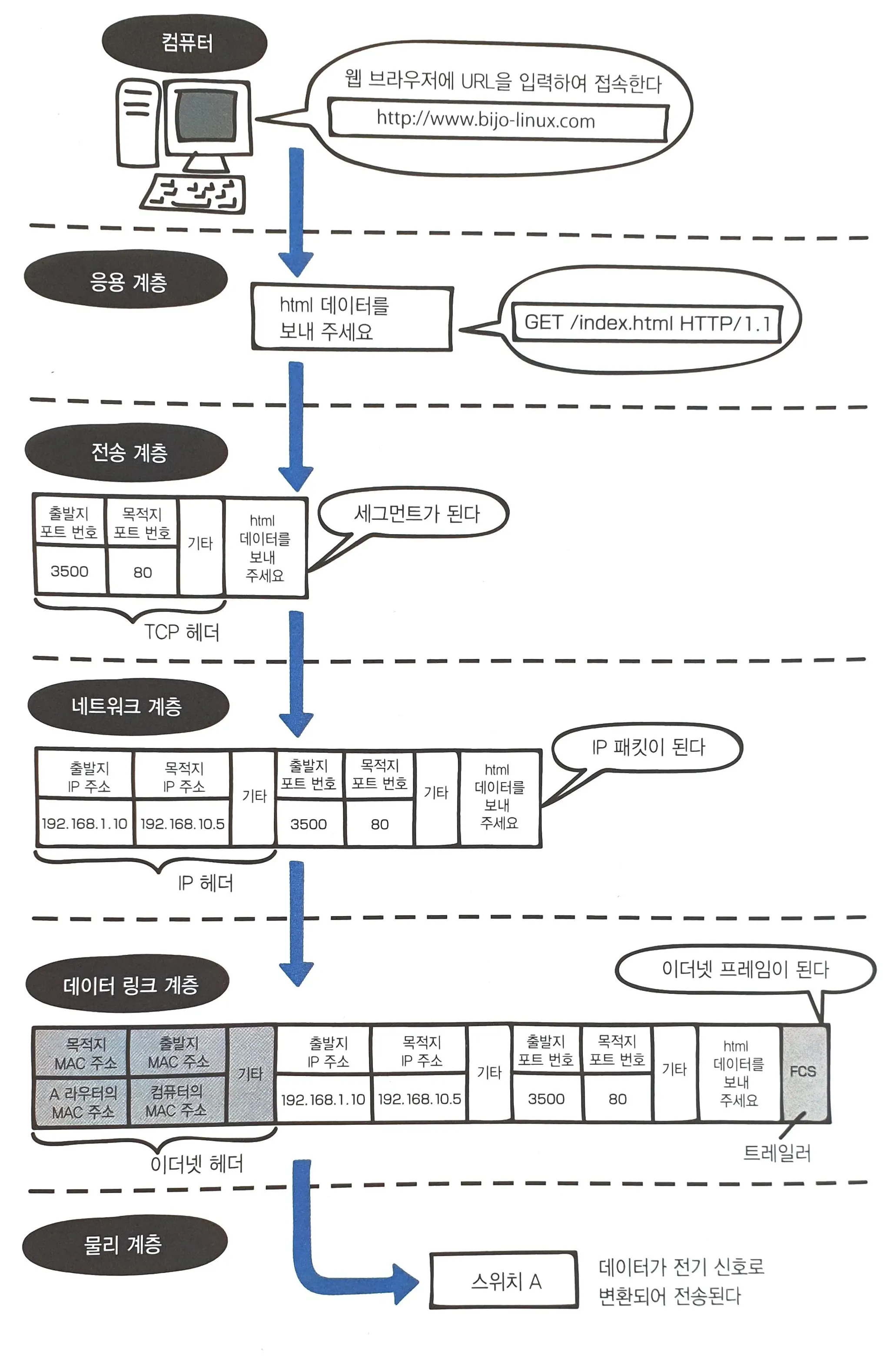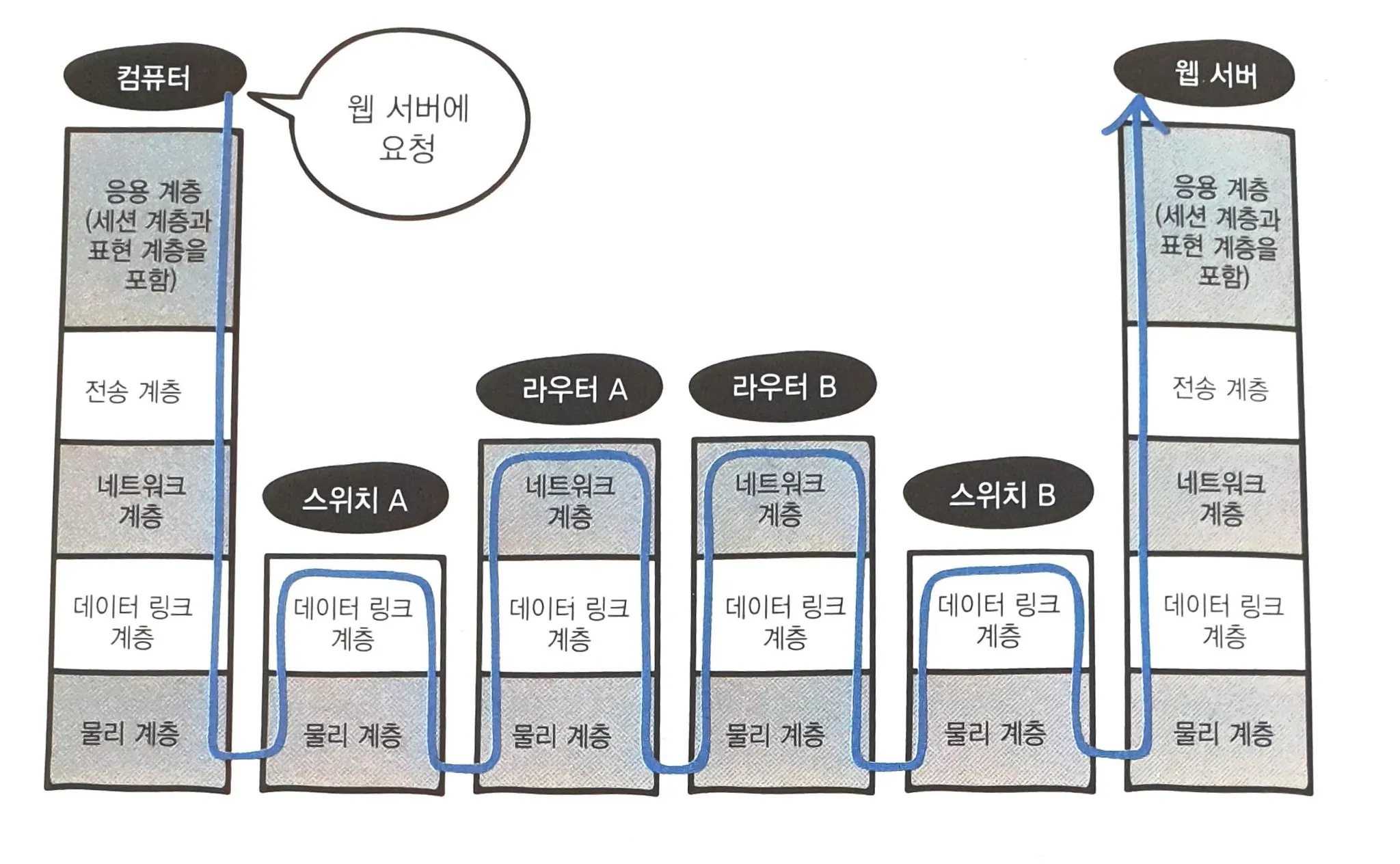 컴퓨터에서 보내고자 하는 메세지를 이와 같이 캡슐화하여 네트워크로 전송하게 된다.