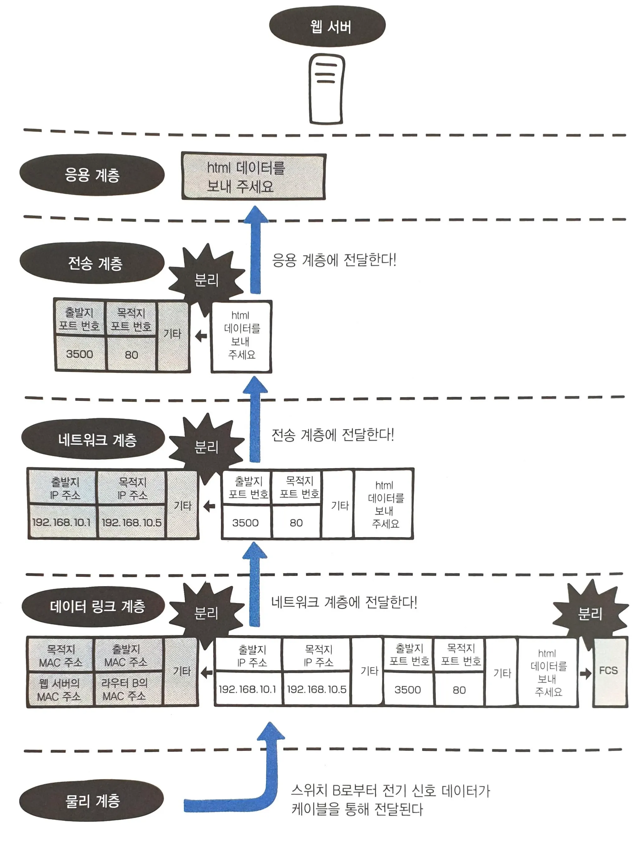 웹 서버에서는 각 계층별로 역캡슐화를 진행하며 데이터가 맞게 도착했는지를 확인하고, 최종 목적지인 어플리케이션에서 메세지를 확인한다.
