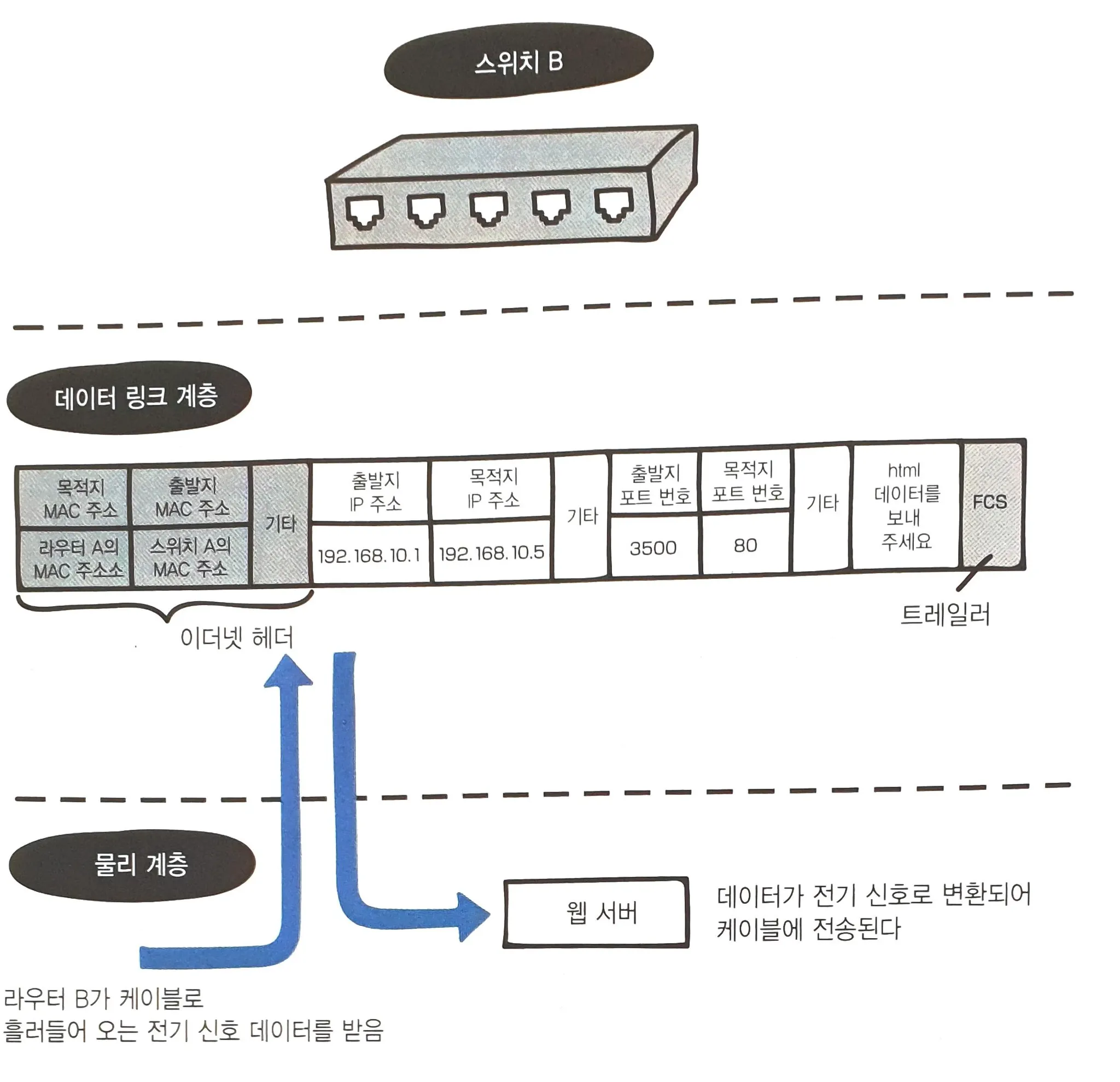 스위치 B에서는 이더넷 헤더에서 MAC 주소를 확인하고 웹 서버로 전송한다.