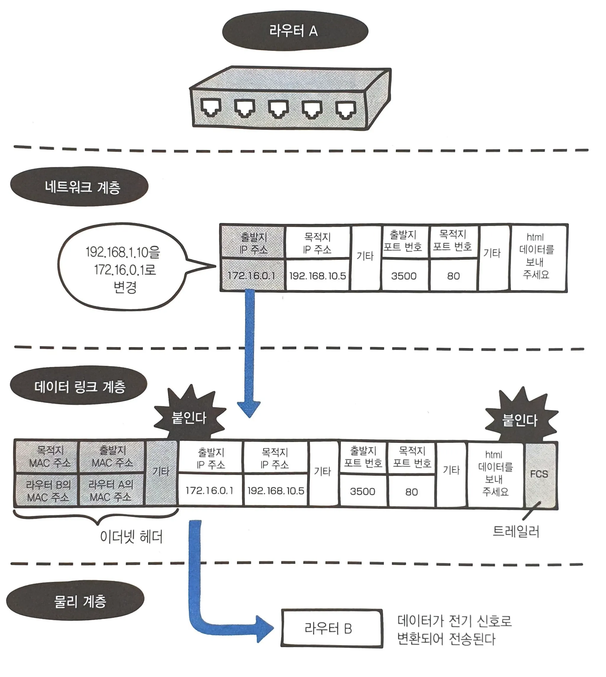 그 후 사설 IP 주소를 공인 IP 주소로 변경하고, 새로운 MAC 주소를 첨부한 이더넷 헤더를 붙여 라우터 B로 전송하게 된다.