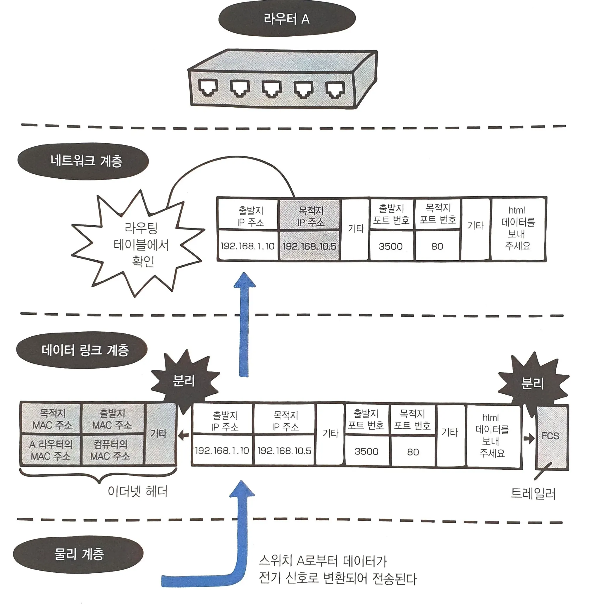 라우터 A에서는 데이터 링크 계층에서 이더넷 헤더를 분리하고, 네트워크 계층에서 IP 헤더의 목적지 IP 주소를 읽어 라우팅 테이블에서 확인한다.
