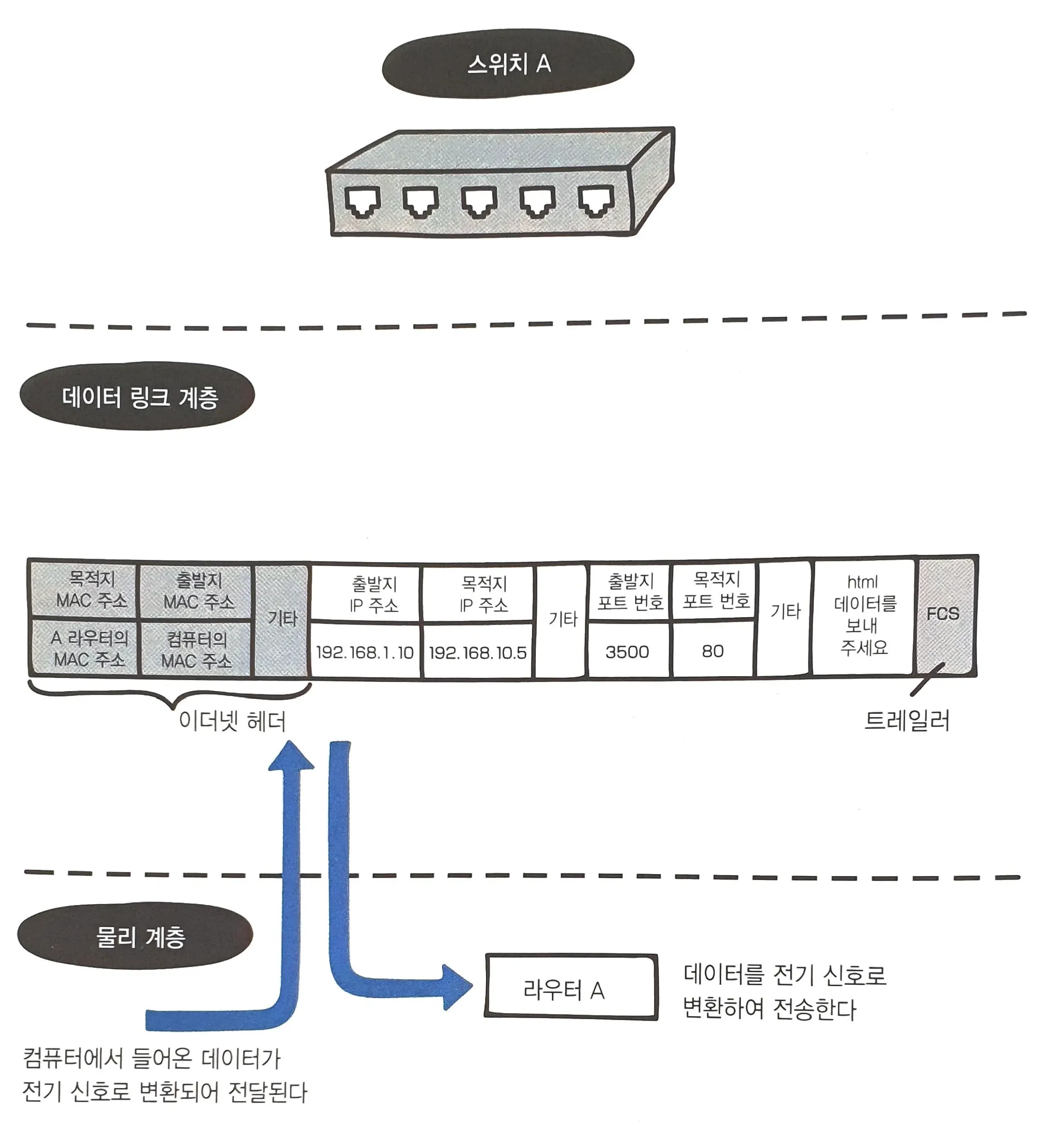 컴퓨터와 맞닿아있는 스위치에서는 이더넷 헤더에서 MAC 주소를 확인하고 라우터 A로 전송한다.