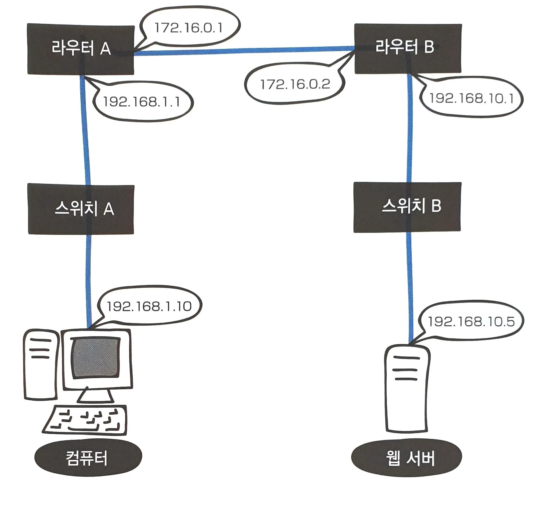 그림과 같은 네트워크에서 컴퓨터에서 웹 서버에 HTTP 요청을 보내는 과정을 살펴보자.