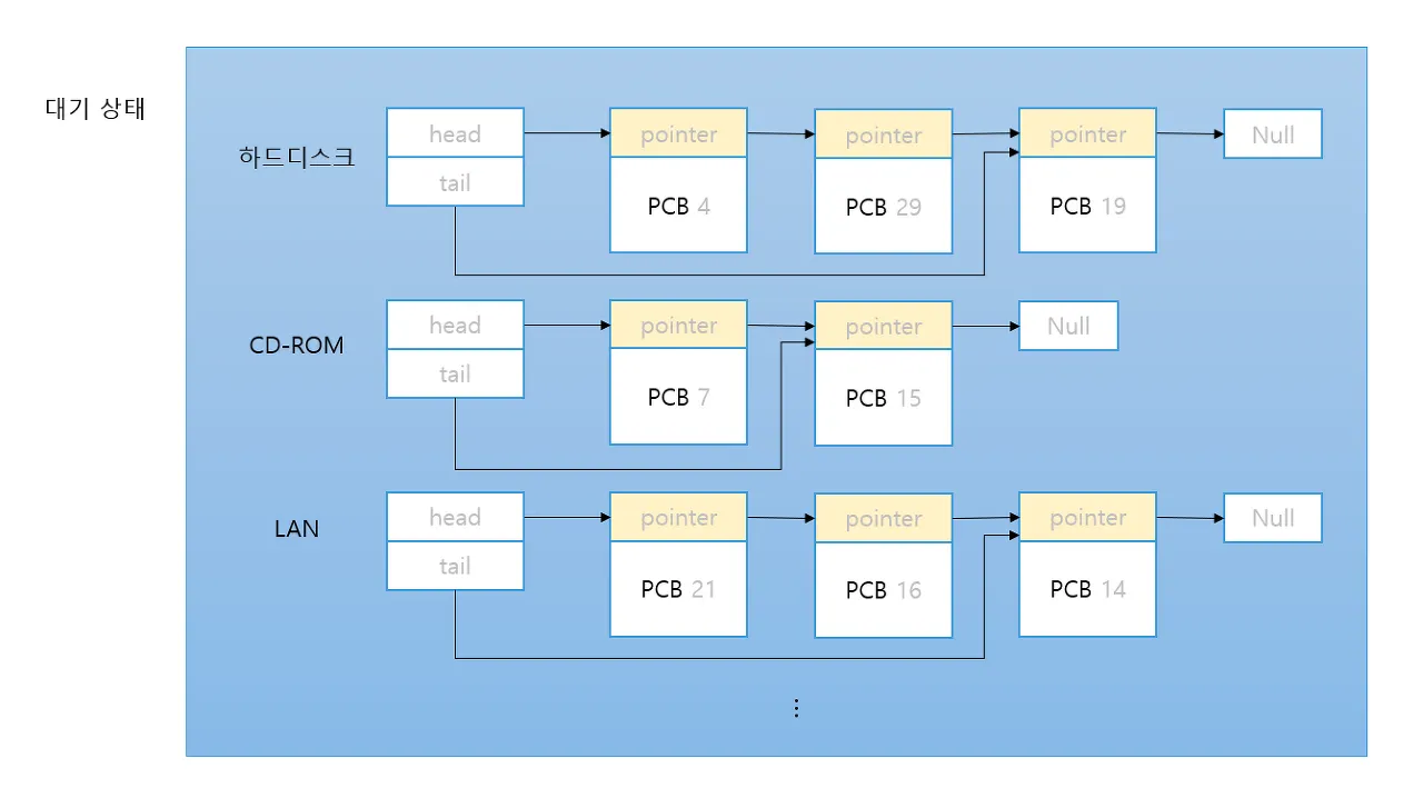 입출력 작업이 완료되기를 기다리는 프로세스는 대기 상태를 가지는데, 이런 대기 상태의 프로세스들을 하나로 모아두면 인터럽트가 발생했을 때 이렇게 모아둔 프로세스들을 전부 뒤져봐야하기 때문에 관리가 불편하다. 그렇기 때문에 대기 상태의 프로세스들을 같은 입출력을 요구한 프로세스끼리 아래처럼 linked-list나 큐를 통해 모아놓는다.