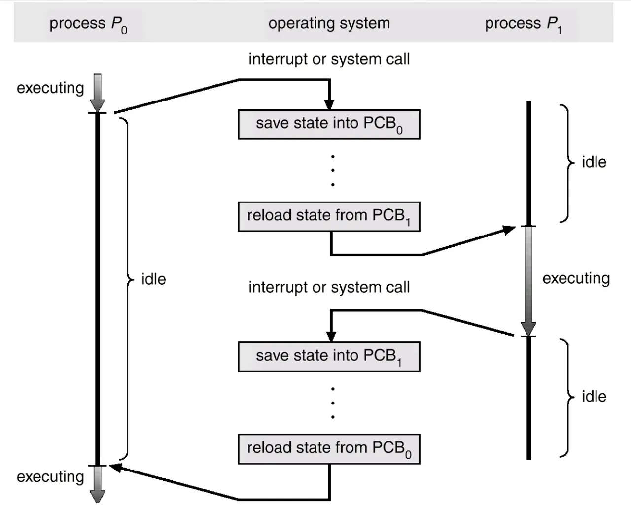P0를 실행 중 interrupt나 system call이 발생하면 P0의 상태를 PCB0에 저장한다.