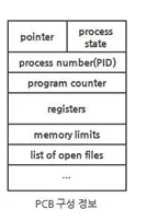 프로세스 제어블록의 첫 블록에는 포인터가 저장된다. 여러 프로세스들 중 준비 상태나 대기 상태인 프로세스들은 큐를 통해서 관리되는데, PCB를 통해 준비 상태 큐나 대기 상태 큐를 구현할 때 포인터가 사용된다.
