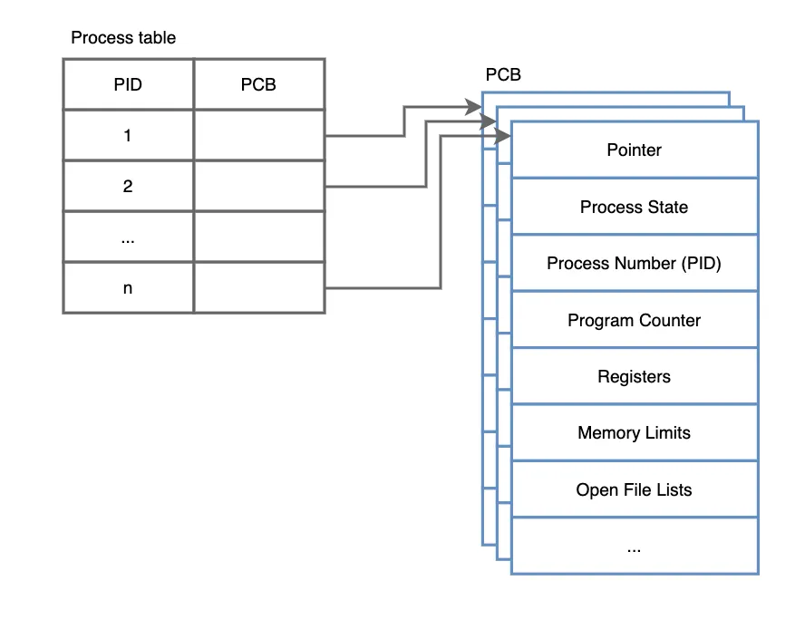 운영 체제는 빠르게 PCB에 접근하기 위해 프로세스 테이블을 사용하여 각 프로세스의 PCB를 관리한다.