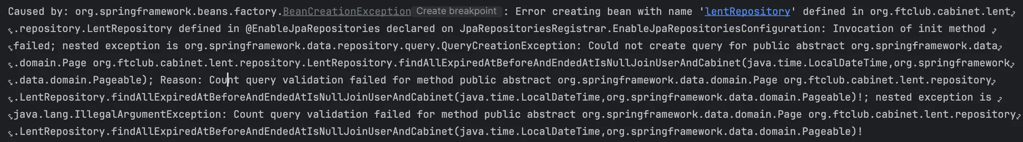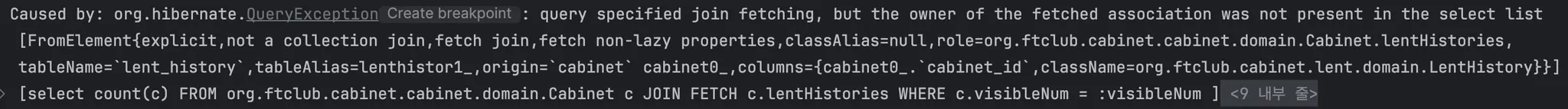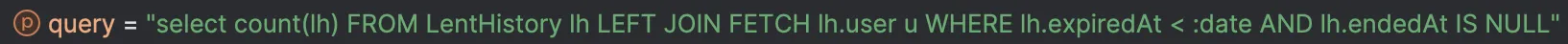 이 때 컬렉션에 엔티티가 없으면 아까 보았던 에러가 발생하게 되는데, 위에서 작성한 쿼리로 생긴 Count 쿼리의 Select 구문에는 count(lh) 밖에 없으니 해당 컬렉션에는 아무것도 들어있지 않다. 따라서 에러가 발생하는 것이다.