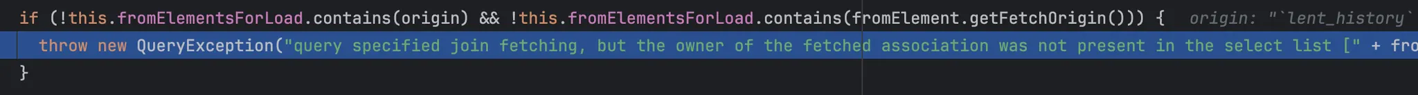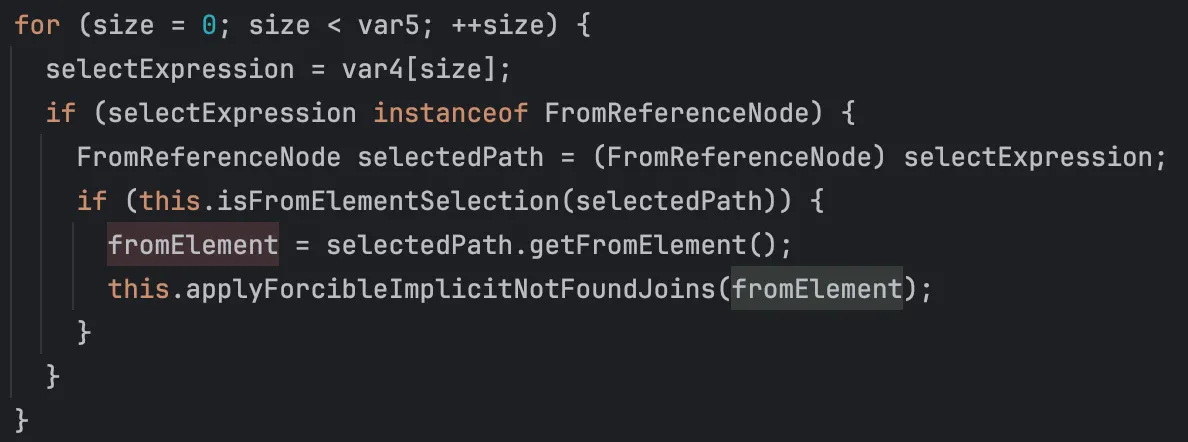 그 후 이전의 파서에서 파싱한 쿼리에 존재하는 엔티티들을 담은 fromElements 컬렉션을 순회하며, From 절에 포함된 엔티티를 제외하고 나머지 엔티티들이 fromElementsForLoad 컬렉션에 해당 엔티티가 있는지 확인한다.