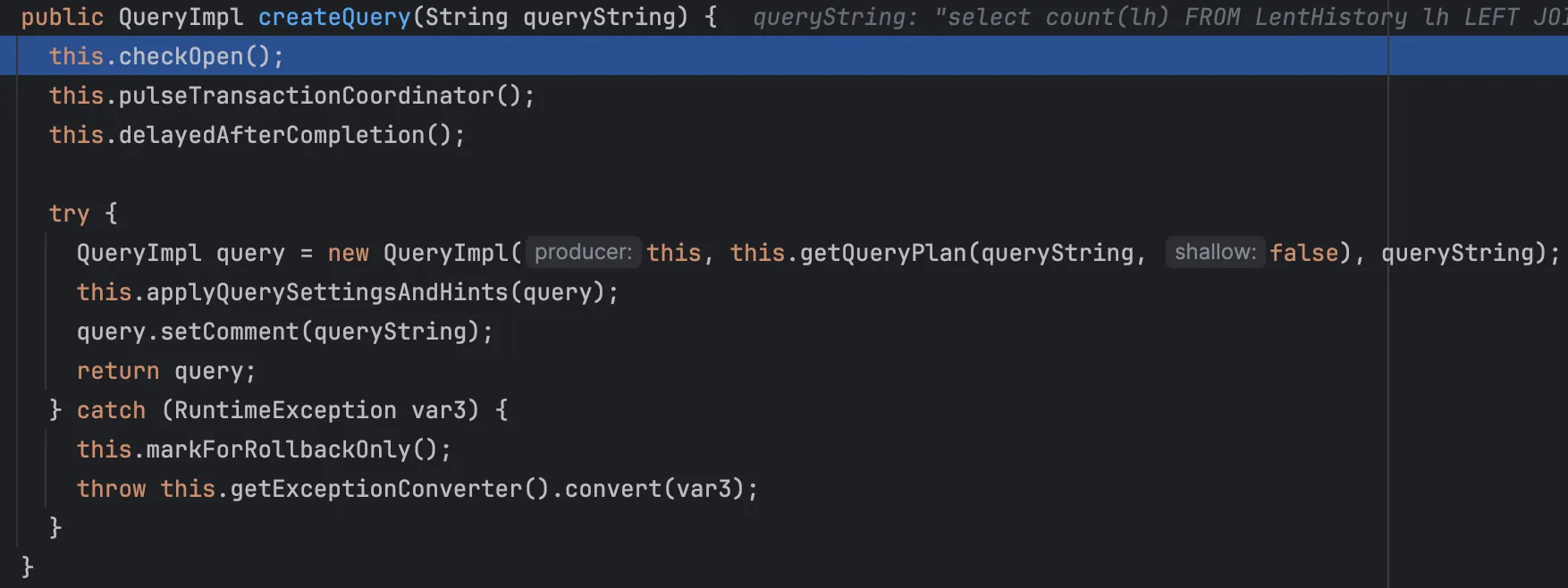 이후 생성된 Count 쿼리 String으로 QueryImpl을 생성한다. 그 과정에서 내부적으로 파서를 통해 구문을 분석하는데,