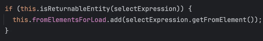 이후 selectExpressions를 순회하면서, select로 선택된 인자들 중 엔티티 형태로 반환해야 하는 것들을 fromElementsForLoad라는 컬렉션에 담는다.