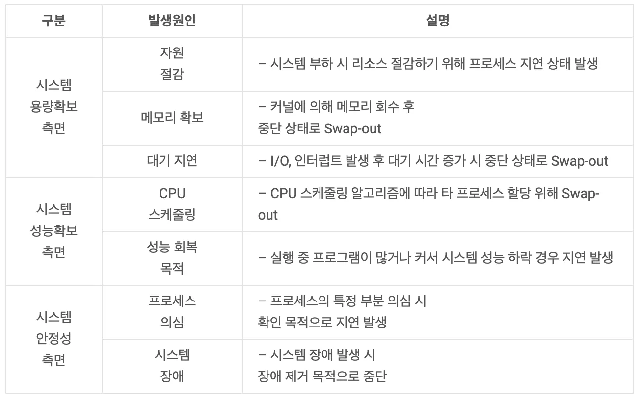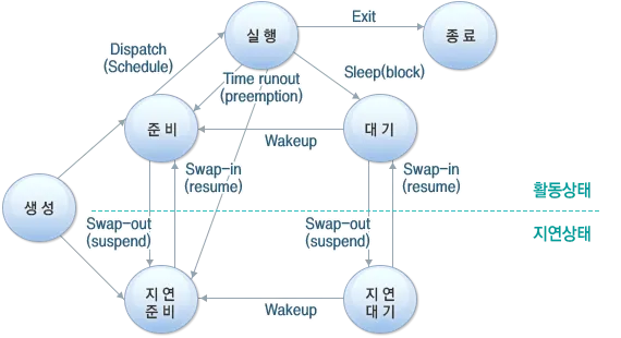프로세스 생성 후 메모리 부족 혹은 준비 상태의 프로세스가 기억장치를 읽어버린 경우 커널에 의해 메모리를 회수 당하고 지연 상태로 바뀌게 되는 것을 swap-out이라 한다.