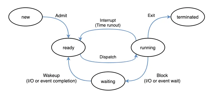생성(New): 프로세스가 생성 중인 상태. 프로세스 생성을 위한 여러 작업(PCB 생성)과 스케줄러 승인 등의 과정을 밟고 있는 상태로, 생성이 완료되면 준비 상태로 넘어간다.