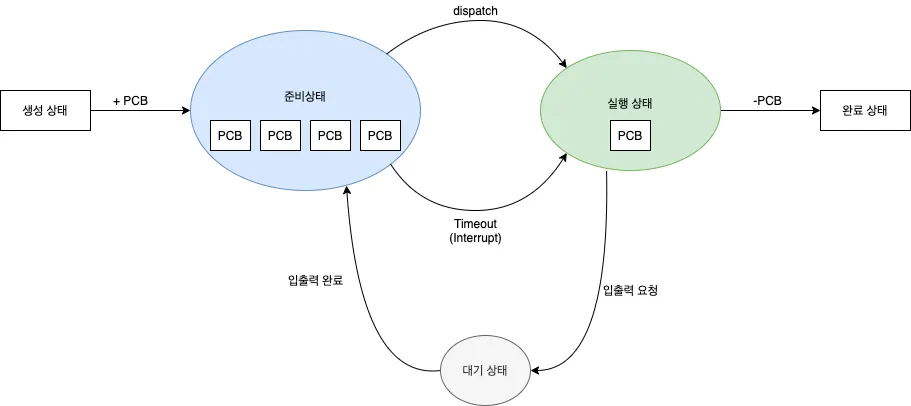입출력 작업의 경우 CPU의 속도보다 매우 느리기 때문에, 이를 기다리는 것은 비효율적이다. 때문에 입출력 작업을 받으면 프로세스를 대기 상태로 바꾸고, 준비 상태 프로세스들 중 하나를 실행 상태로 바꾸어 작업을 수행한다.