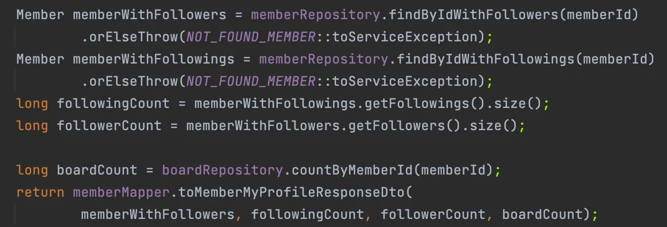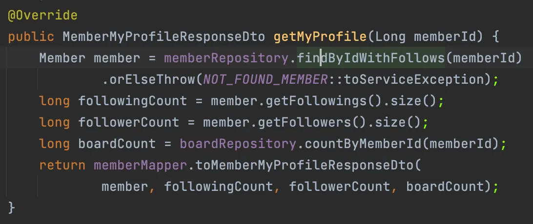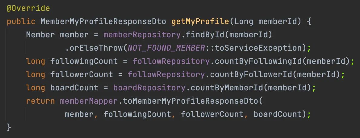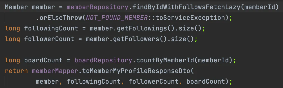 로직에 대해서 간략하게 설명해보자면, member를 조회해와서 해당 멤버를 팔로우 하는 사람과 팔로우 하고 있는 사람의 수, 해당 member가 올린 게시글의 수를 계산하여 DTO로 변환하는 로직이다.