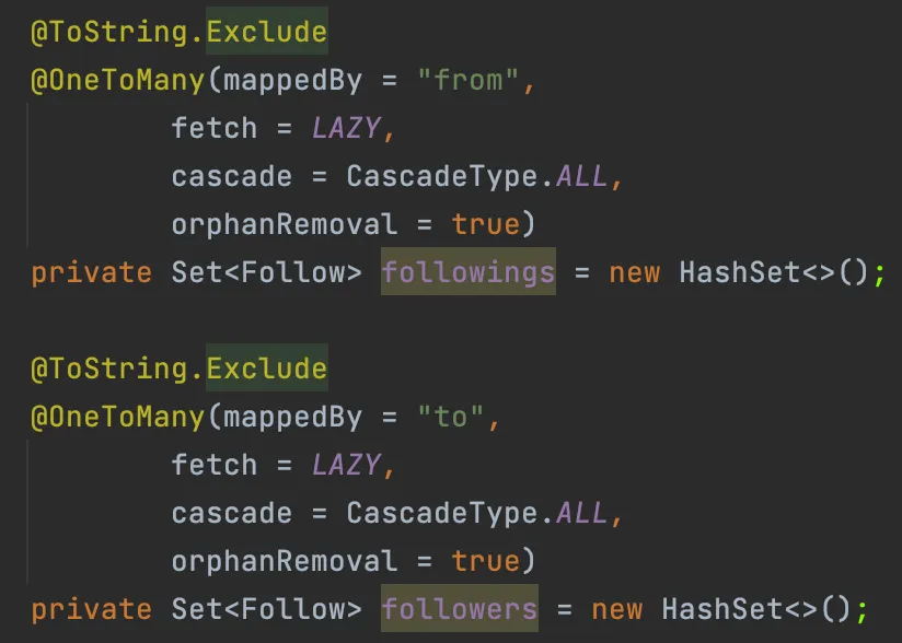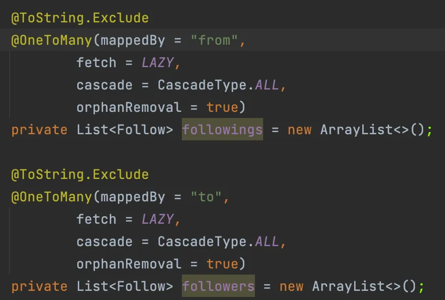 위 상황에서는 OneToMany인 followers와 followings가 둘 다 List로 받기 때문에, 두 필드를 모두 fetch join하려 시도했더니 MultipleBagFecthException이 발생한 것이다.