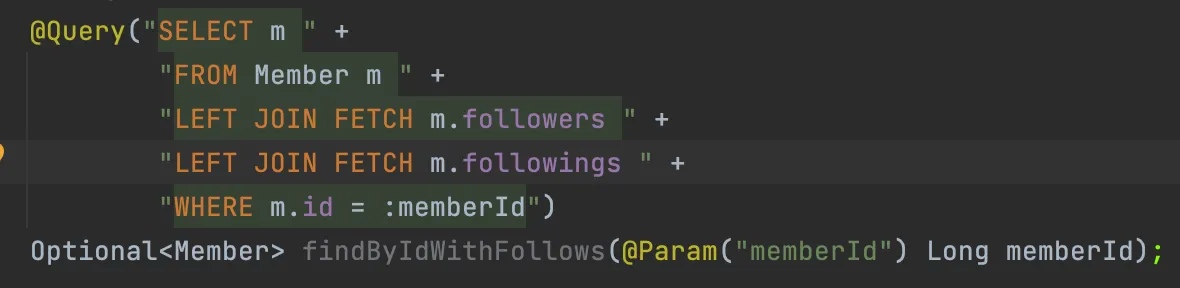 위의 코드에서는 follower의 순서가 중요하지 않다는 가정 하에 Set으로 바꾸고 Fetch Join으로 쿼리 한 번에 다 조회해오는 로직을 작성했다.