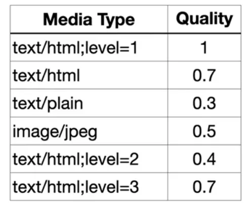 예시) Accept: text/*;q=0.3, text/html;q=0.7, text/html;level=1, text/html;level=2;q=0.4, */*;q=0.5