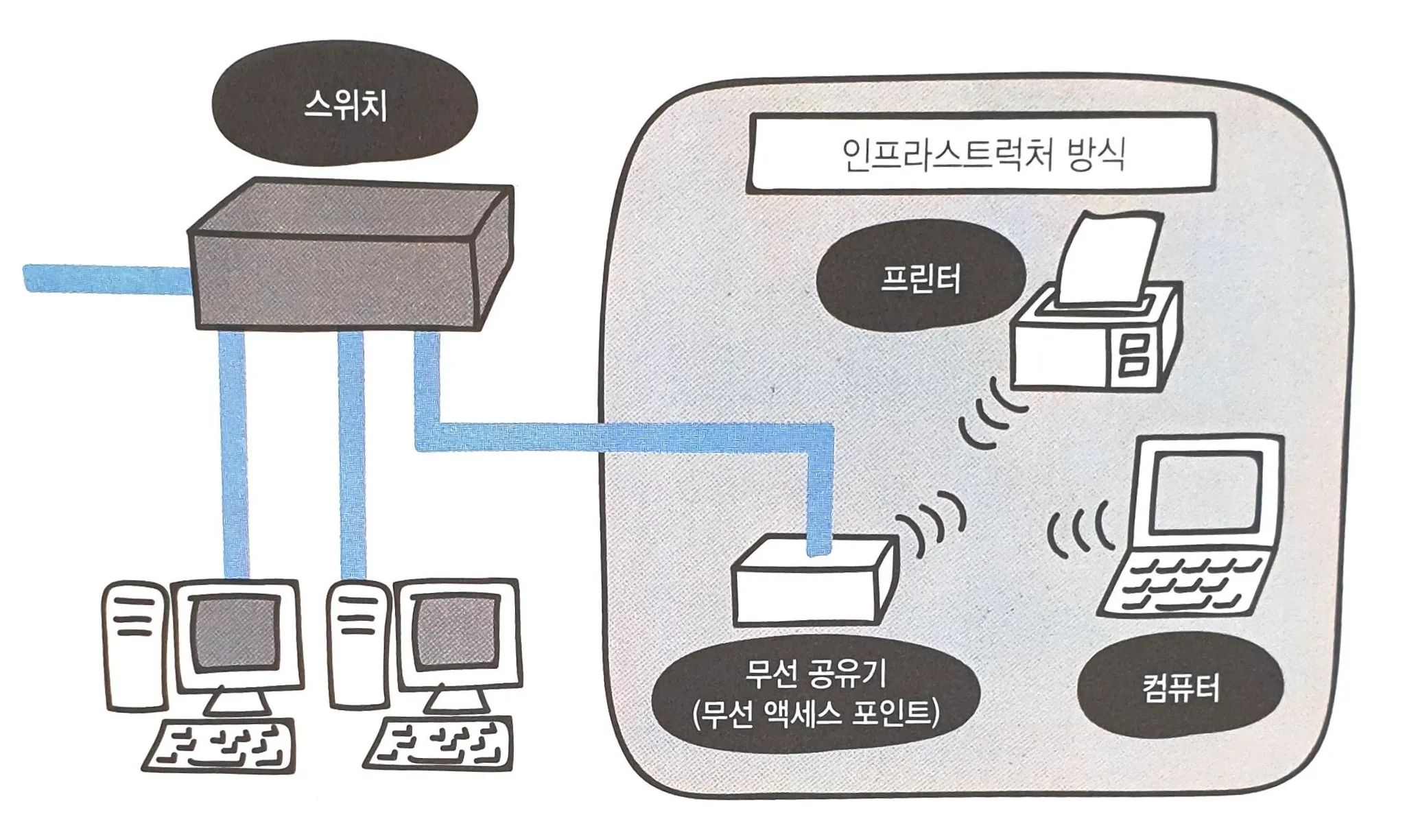 인프라스트럭처 방식은 무선 액세스 포인트에 여러 무선 클러이언트들이 접속하여 통신하는 방식을 말한다.