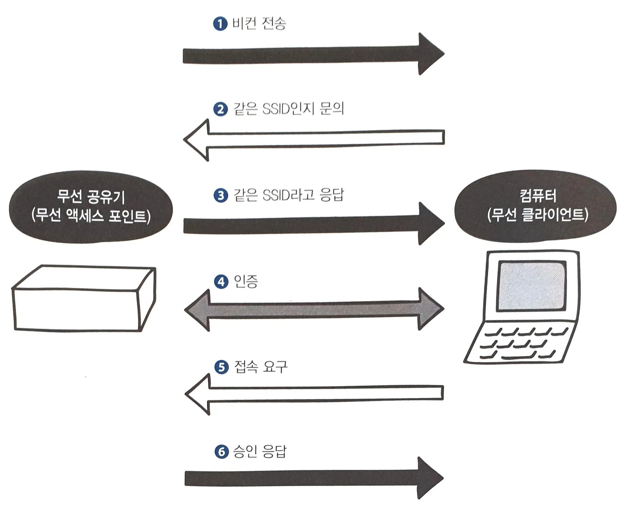인프라스트럭처 통신 방식에서 무선 랜 통신 절차를 살펴보면, 일정 절차에 따라 서로 데이터를 주고 받아 상호 확인 후 접속하여 통신한다.