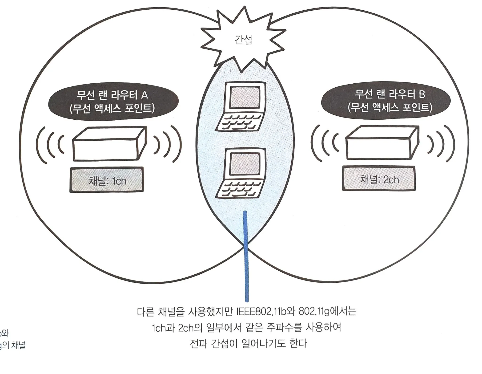 무선 랜은 이런 상황에서 여러 기기들이 서로 간섭을 받지 않도록 하기 위해, 주파수 대역을 분리하여 액세스 포인트마다 서로 다른 주파수 대역을 사용한다. 이러한 주파수 대역을 채널이라 부르고, 채널 간에 간섭이 발생하지 않도록 주파수 대역을 잘 설정해야한다.