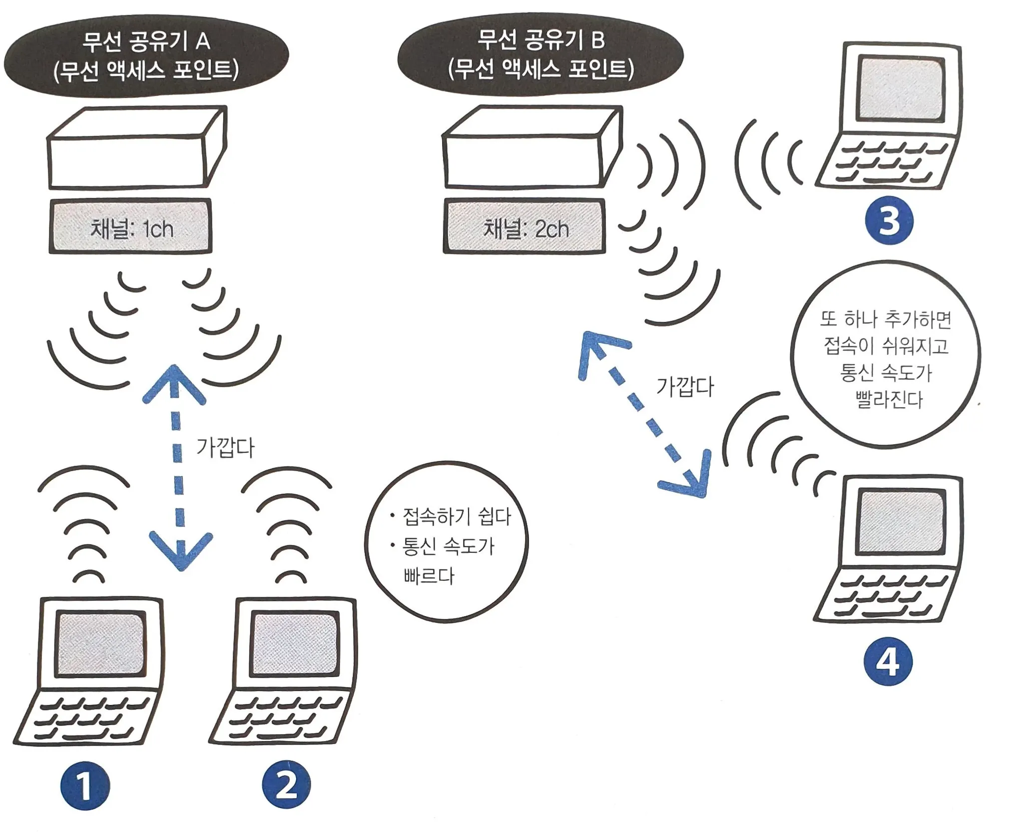 무선 액세스 포인트와 무선 클라이언트 사이의 거리가 멀어질수록 전파가 약해져 접속이 안되거나 통신이 느려지기 때문에, 넓은 지역에서 무선 랜을 사용하고 싶은 경우에 무선 액세스 포인트를 여러 곳에 설치하게 된다.
