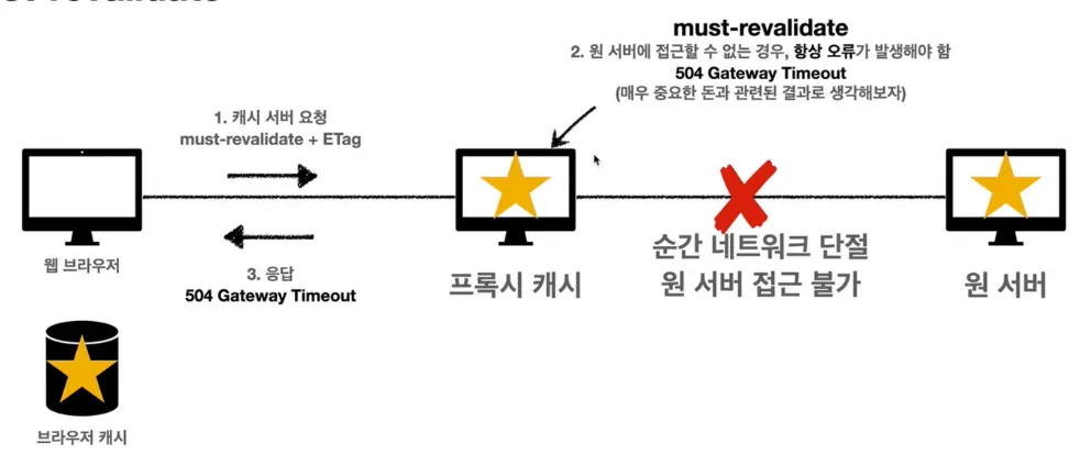 must-revalidate의 경우에는 원서버의 검증을 꼭 해야하기 때문에 클라이언트에 504 Gateway Timeout을 보내게 된다.