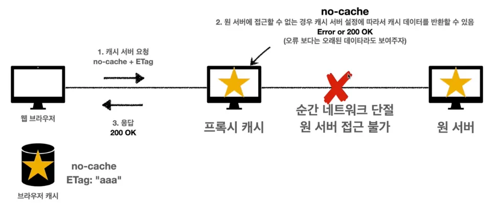 no-cache의 경우에는 프록시 서버의 정책에 따라 이미 저장되어있던 오래된 캐시 데이터를 반환하거나 캐시 데이터가 없다고 응답할 수있다.