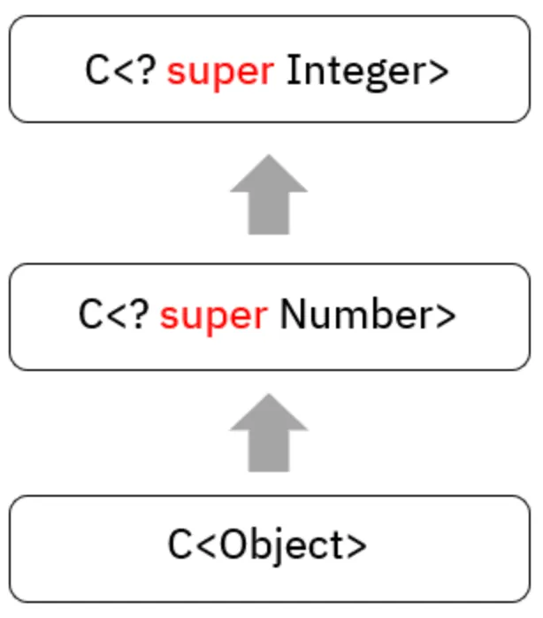 <? super T> // Lower Bounded Wildcards : T 타입과 T 타입이 상속받은 조상(부모) 클래스 타입만 사용 가능